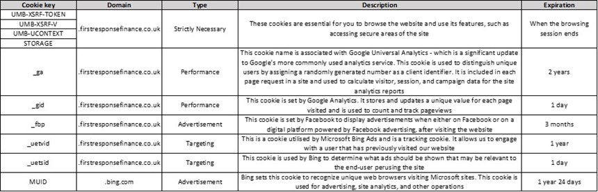 Welcome to www.firstresponsefinance.co.uk ('site'). Our website may use cookies to distinguish you from other users of our site. This helps us to provide you with a good experience when you browse our website and also allows us to improve our site. Here you will find information on what cookies may be set when you visit our site and the purposes for which we use those cookies. The site is owned and operated by First Response Finance Limited ('FRFL', 'we', 'our', 'us' as applicable). For further detailed information about this site, visit our Terms and Conditions and Privacy Policy pages.